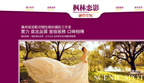 楓林戀影是廣州知名的婚紗攝影工作室,一個在廣州婚紗攝影中擁有良好口碑的品牌,以化妝的精致、婚紗的個性與時尚、和與眾不同的拍攝方式,贏得每對新人的贊許,成為廣州婚紗攝影的倡導(dǎo)者。專業(yè)的服務(wù)團(tuán)隊,一流的攝影設(shè)備,不管時尚、浪漫、古典、個性、唯美...楓林戀影的專業(yè)攝影師都能讓你獲得意外的驚喜。
