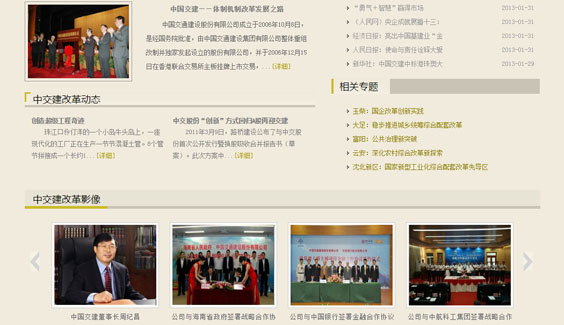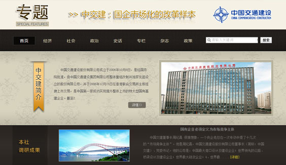 負(fù)責(zé)中國交建專題頁面的設(shè)計(jì)制作,該頁面以黑色為主色調(diào),加以棕、黃為點(diǎn)綴加以突出,符合企業(yè)特點(diǎn),體現(xiàn)企業(yè)沉穩(wěn)、安全、實(shí)力雄厚。整個(gè)設(shè)計(jì),簡潔,大方,彰顯企業(yè)實(shí)力。