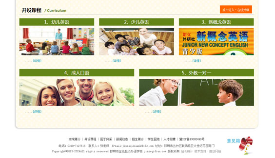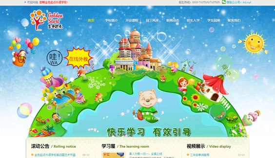 負(fù)責(zé)邯鄲市金色起點(diǎn)外語(yǔ)學(xué)校網(wǎng)站設(shè)計(jì)制作開(kāi)發(fā)等網(wǎng)站建設(shè)服務(wù),金色起點(diǎn)是一所面向兒童的外語(yǔ)高級(jí)培訓(xùn)學(xué)校,故網(wǎng)站設(shè)計(jì)時(shí)注重活潑、可愛(ài)、時(shí)尚等特點(diǎn),金色起點(diǎn)網(wǎng)站設(shè)計(jì)以藍(lán)色為主打系,黃色為輔助色系,采用先進(jìn)的動(dòng)態(tài)flash技術(shù)使整個(gè)網(wǎng)站生動(dòng)、形象、活潑等,結(jié)合學(xué)校的特點(diǎn),以黃色為點(diǎn)輟,襯托年輕、成長(zhǎng)、可愛(ài)的的學(xué)習(xí)畫(huà)卷。